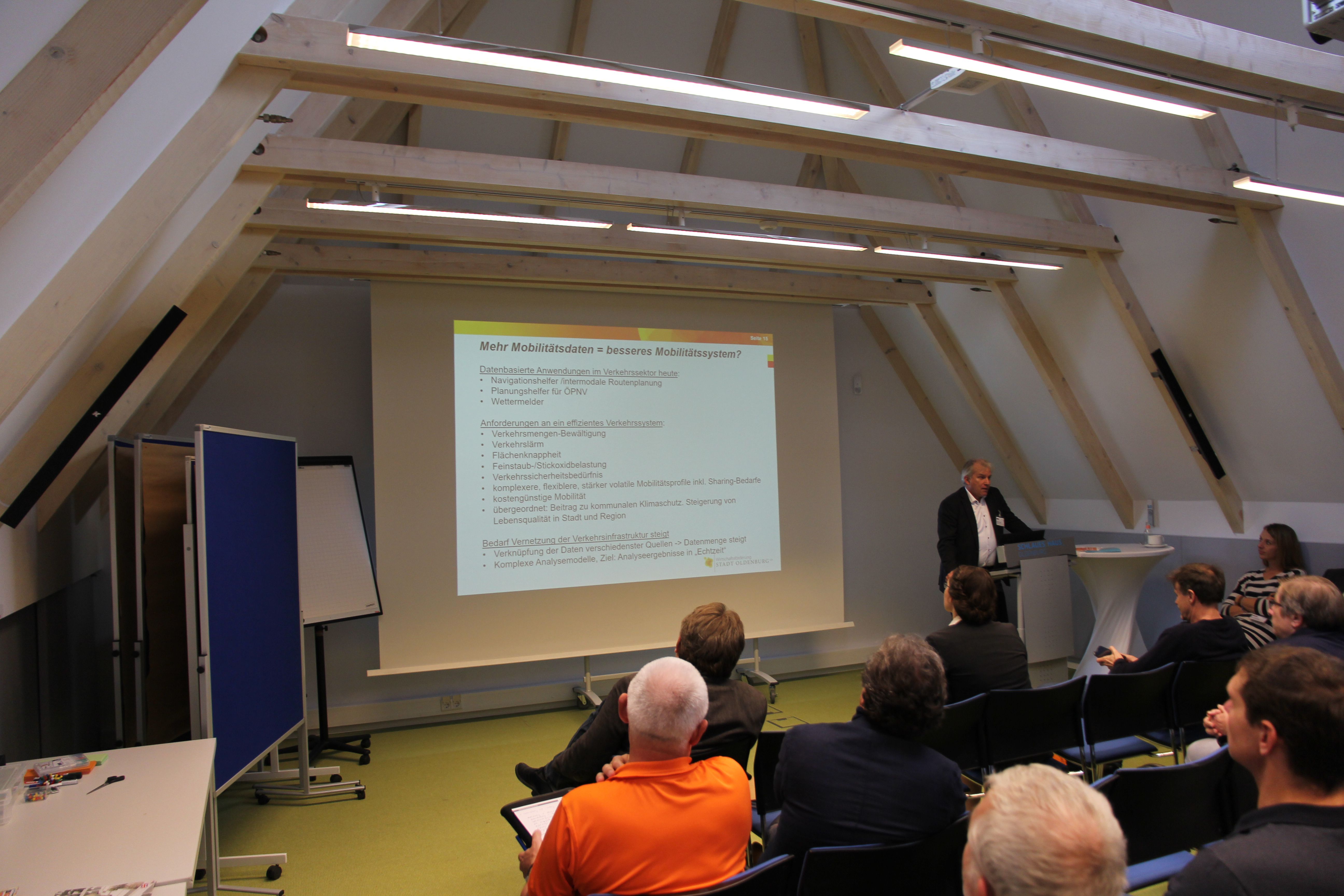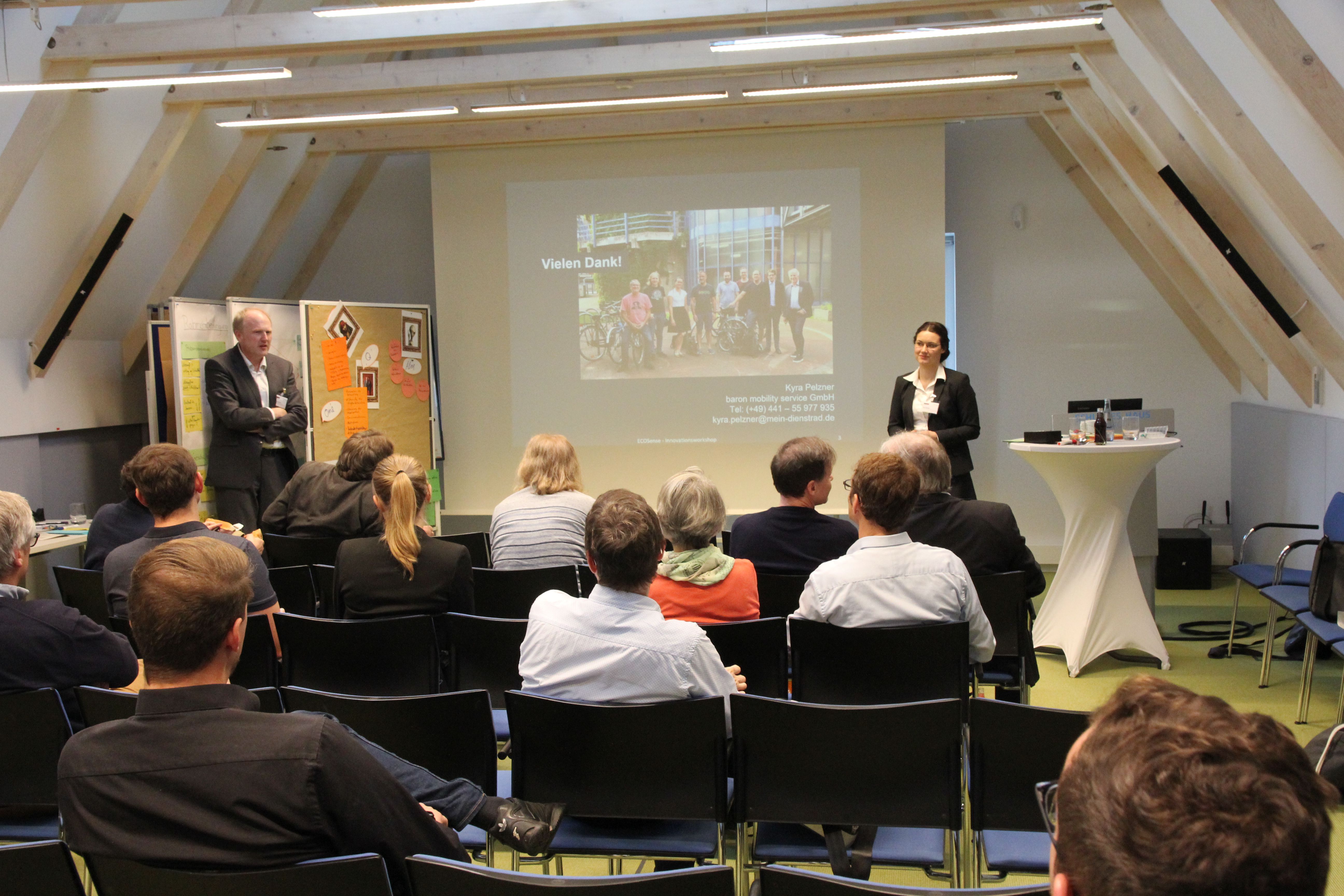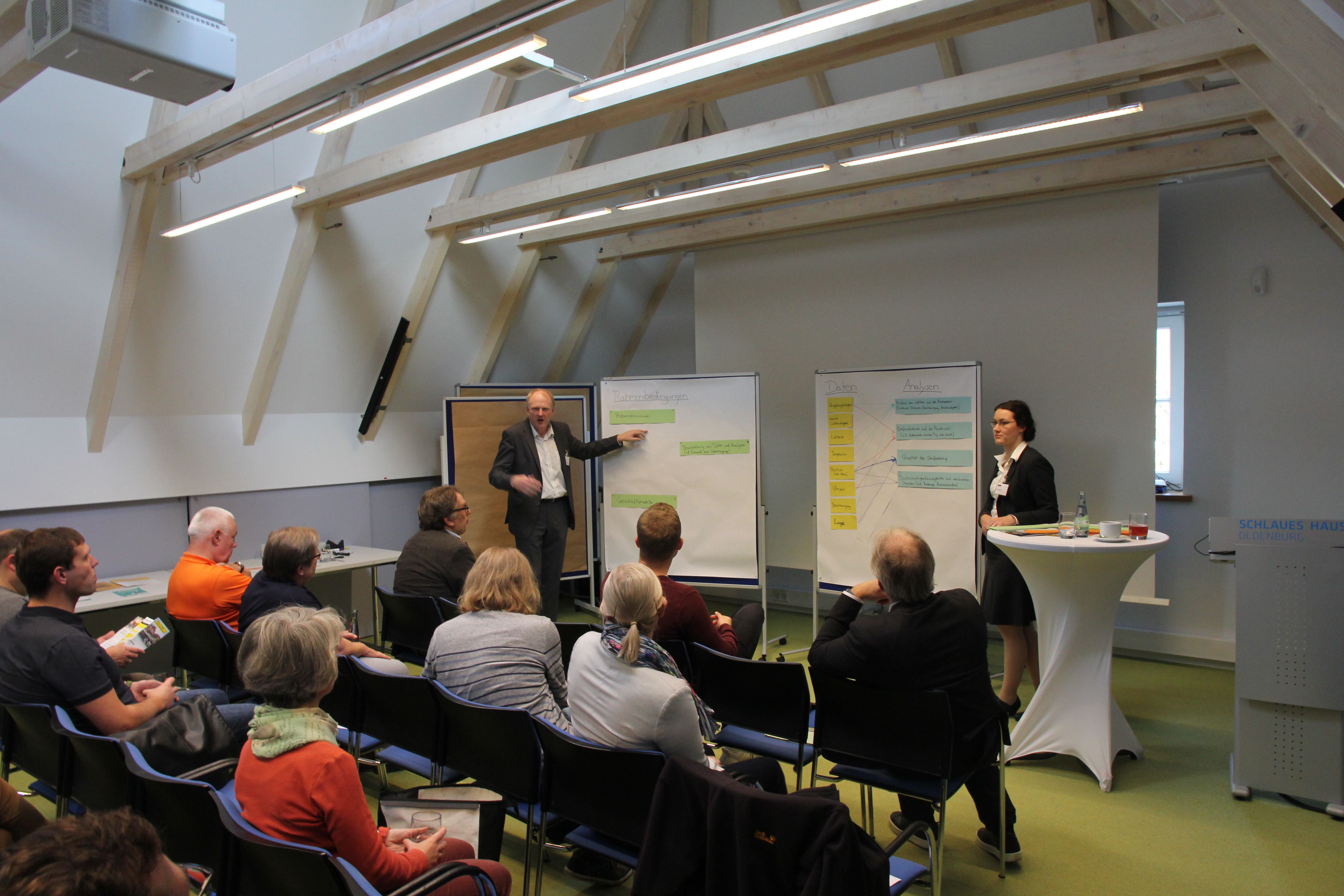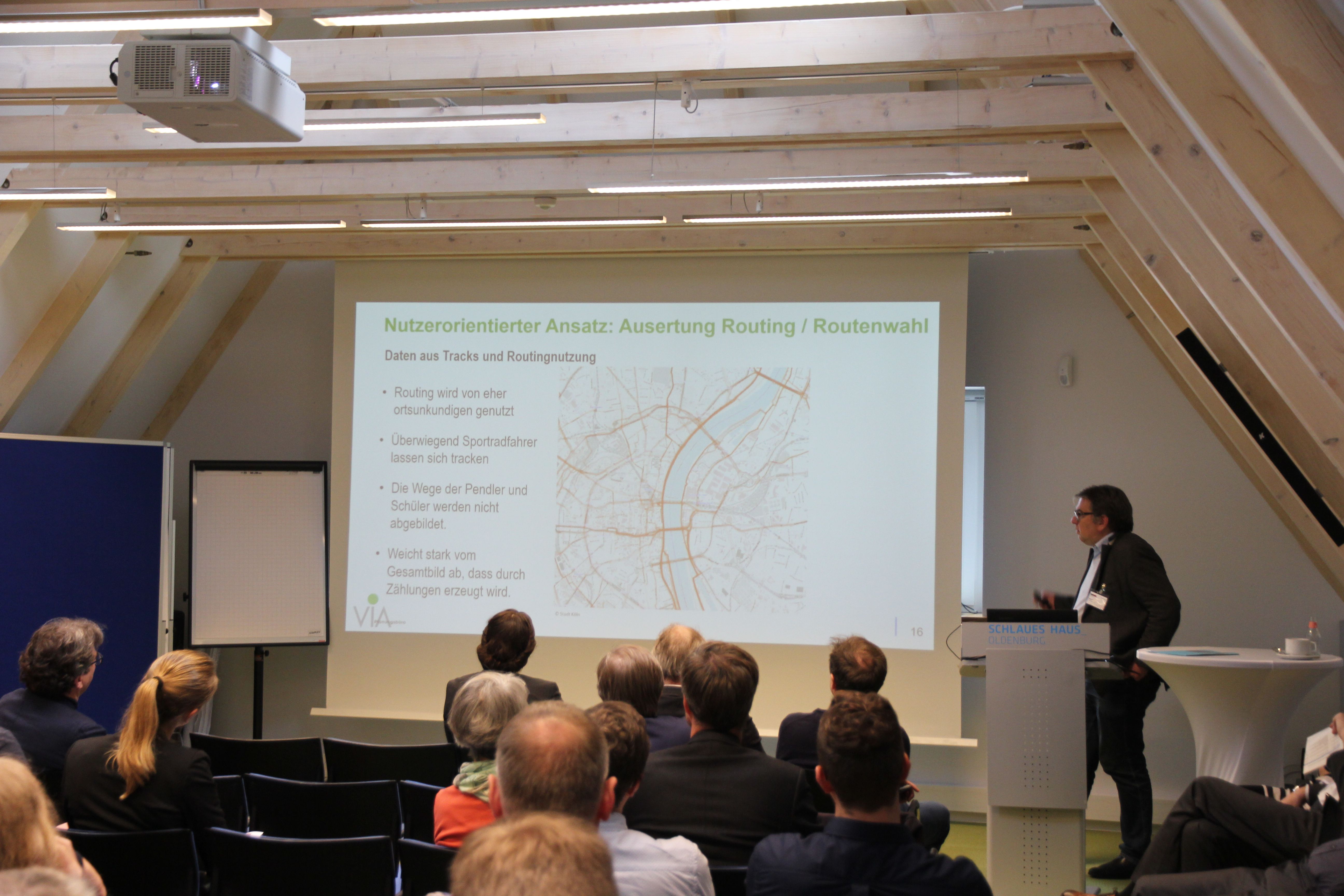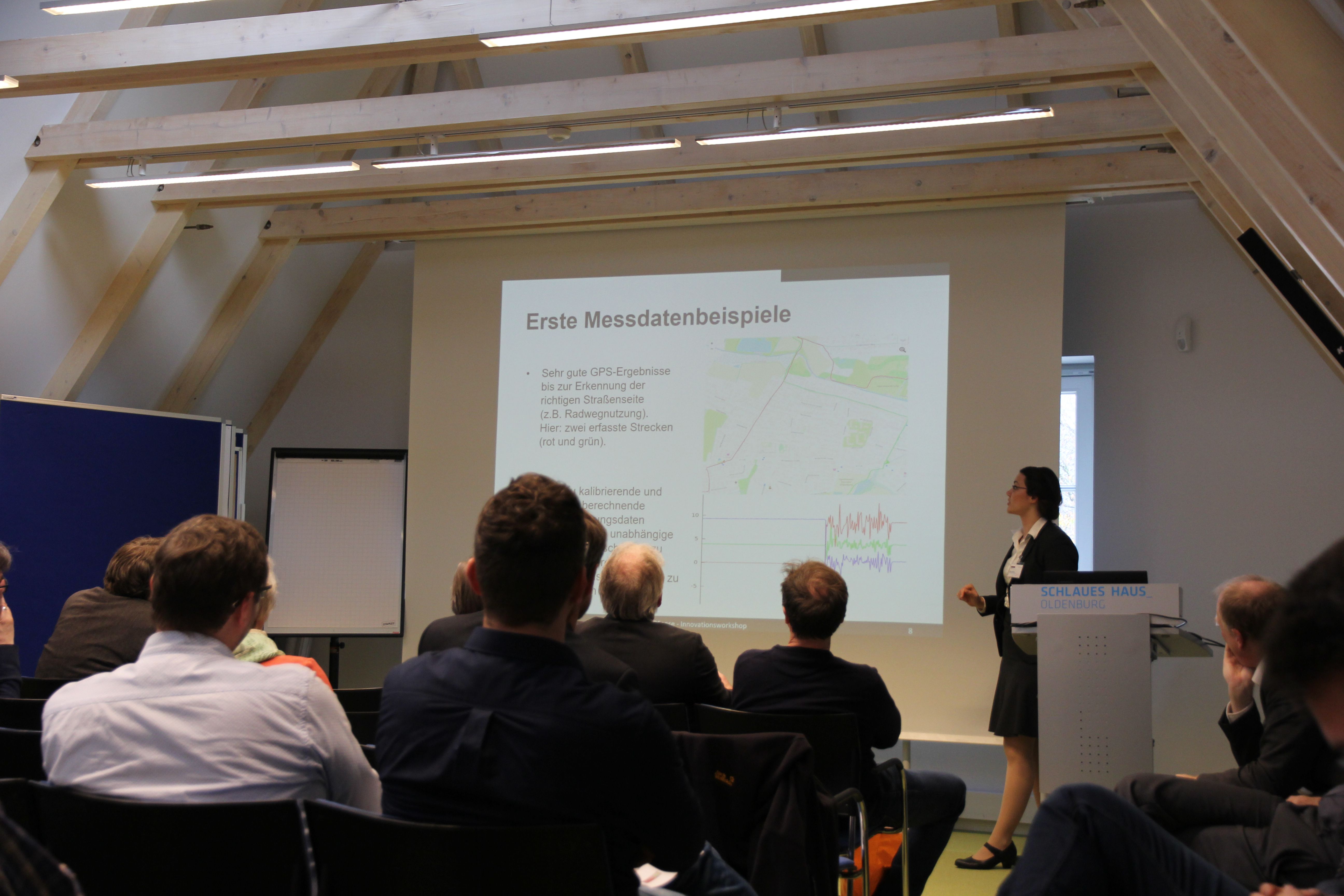 Der vom Projekt ECOSense veranstaltete Innovationsworkshop fand am 21.10.2019 im Schlauen Haus in Oldenburg statt. Zum Workshop waren die zahlreichen assoziierten Partner des Projekts aus Kommunen, Verkehrsplanung, Forschung und Unternehmen eingeladen. Mit etwa 40 Teilnehmenden wurden in zwei Workshops der Ansatz des Projekts ECOSense kritisch reflektiert und Zukunftsvisionen für den Einsatz von Sensorik im Bereich Radinfrastruktur entwickelt. Die Teilnehmenden gaben dem Projekt unter anderem Feedback zu möglichen Analysen und nannten dabei Verlustzeiten (Bremsen, Beschleunigung und Standzeiten), Parkzeiten und -orte sowie den soziodemografischer Einfluss auf das Fahrverhalten als weitere interessante Analysen. Dabei wurde deutlich, dass je nach Analyse durchaus ein Spannungsfeld zwischen den Informationsbedürfnissen der Kommunen und Verkehrsplanung und dem Schutz personenbezogener Daten der ProbandInnen bestehen kann. Auch wurde dem Projekt empfohlen die Datenerhebung auch im April stattfinden zu lassen, um die Daten besser mit bisher erhobenen Radverkehrsdaten vergleichen zu können.
