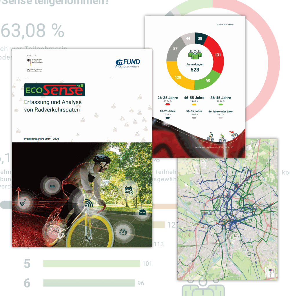 Ziel von ECOSense war die Entwicklung und Erprobung einer Sensorplattform, die verschiedene Parameter (Position, Geschwindigkeit, Erschütterung, Umwelt) zur Fahrradnutzung im Alltag erhebt. Insgesamt wurden 272 Sensoren während des Erhebungszeitraums an verschiedene Fährrändern angebracht. Die so erhobenen Daten wurden anschließend mit weiteren Datenquellen veredelt und im Hinblick auf die Streckenauswahl, die Oberflächenbeschaffenheit der Fahrradstrecken, das Fahrverhalten (u.a. Geschwindigkeit, Bremsungen) sowie Umweltaspekte ausgewertet. Detaillierte Informationen zu den Ergebnissen des Projekts finden Sie in der Abschlussbroschüre.