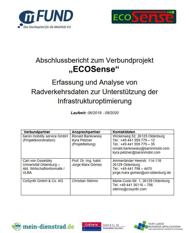 Das mFUND Projekt ECOSense wurde nach einer Laufzeit von insgesamt 15 Monaten Ende August 2020 erfolgreich abgeschlossen. Um die interessierte Öffentlichkeit und externe Partner über die finalen Projektergebnisse umfassend zu informieren, hat das Projektteam nun einen Abschlussbericht veröffentlicht. Dieser bietet einen ausführlichen Einblick in die erzielten Forschungsergebnisse aller beteiligten Projektpartner baron mobility service (mein-dienstrad.de), CoSynth und der Universität Oldenburg, Abteilung für Wirtschaftsinformatik VLBA. Der Bericht enthält viele wissenswerte Daten und Fakten wie etwa zu Vorträgen, die z.B. im Rahmen der mFUND Begleitforschung und der der Fahrradakademie des Deutschen Instituts für Urbanistik stattfinden, wissenschaftlichen Arbeiten und Veröffentlichungen, zu verwandten Projekten aus dem Themenfeld der Fahrradsensorik, sowie einen Ausblick auf offene Fragestellungen, die in Nachfolgeprojekten weiter erforscht werden sollen. Besonderer Dank gilt hier der Förderinitiative mFUND (Modernitätsfonds) und dem Bundesministerium für Verkehr und Digitale Infrastruktur (BMVI), die das Projekt ECOSense mit ihrer Förderung erst ermöglicht haben. Nachfolgeinitiativen, die u.a. eine noch stärkere Einbindung von Bürgerinnen und Bürgern im Rahmen einer nutzerorientierten Qualitätsbewertung der Fahrradinfrastruktur zum Ziel haben, sind bereits in Planung. Der ECOSense-Abschlussbericht kann hier heruntergeladen werden.